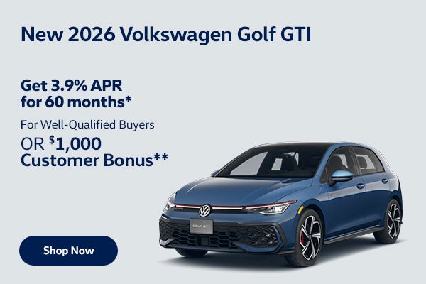 Get 3.9% APR for 60 months OR $1,000 Customer Bonus on New 2026 Volkswagen Golf GTI. *Well-qualified buyers may choose 3.9% annual percentage rate financing for 60 months, $18.37 per month per $1,000 borrowed (financing through Wells Fargo, not all will qualify). No down payment required. **$1,000 Customer Bonus from Volkswagen when you lease or purchase a new 2026 Taos. All Offers: All incentives to dealer, cannot be combined with other offers. Take delivery by 4/30/2026.