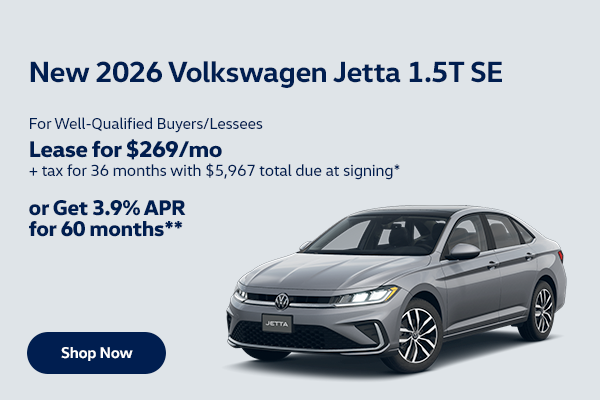 Lease a New 2026 Volkswagen Jetta 1.5T SE for $269/mo or Get 3.9% APR for 60 months (STOCK# VW9730, VIN 3VW7W7BU2TM012302, MSRP $29,774) *Well-qualified lessees may lease for $269/mo for 36 months with $5,967 total due at signing (includes $4,999 customer down, first monthly payment, bank acq fee, $0 security deposit). $420 doc & title prep fees included in monthly payments. Closed end lease. Based on selling price of $28,762. 10,000 miles/year. Sales tax, title, reg/license fees additional. Lease end buy option $19,056. **Well-qualified buyers may choose 3.9% annual percentage rate financing for 60 months, $18.37 per month per $1,000 borrowed (financing through Wells Fargo, not all will qualify). No down payment required. All Offers: All incentives to dealer, cannot be combined with other offers. Take delivery by 3/2/2026.
